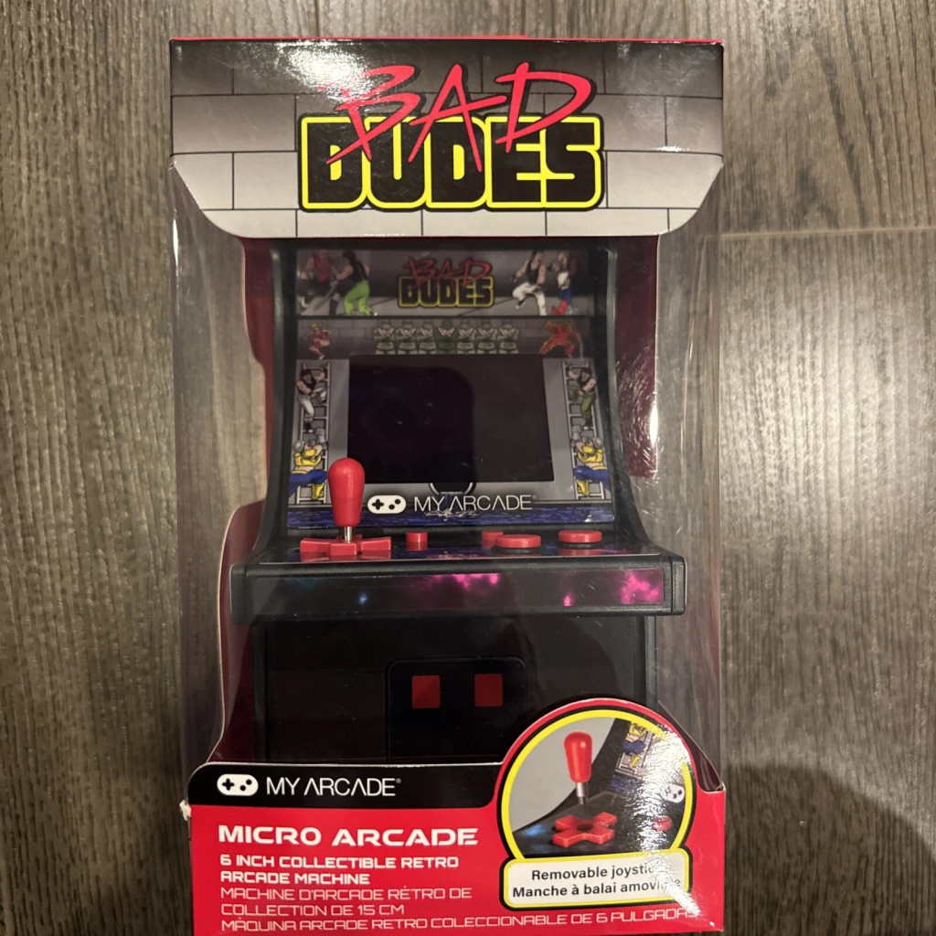 The My Arcade Bad Dudes Micro Player is a small tabletop arcade machine (about 6–7 inches tall) featuring the classic Bad Dudes game. It comes with a built-in screen, joystick, and speaker, and can run on batteries or USB power. It’s marketed as both a playable retro game and a collectable display piece, usually priced in the $25–$45 range.