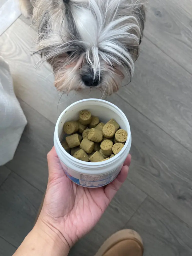Within about 2 weeks of daily chews, the scooting had definitely reduced. Not gone, but I noticed it way less… only the occasional drag instead of frequent floor wiping. And the odour? Big improvement. Before, even walking into the room after he’d settled down would bring a “whoa, what died?” vibe. After a couple of weeks, that dropped significantly. Not perfect, but way more manageable. I also noticed his stools seemed more formed and less inconsistent.