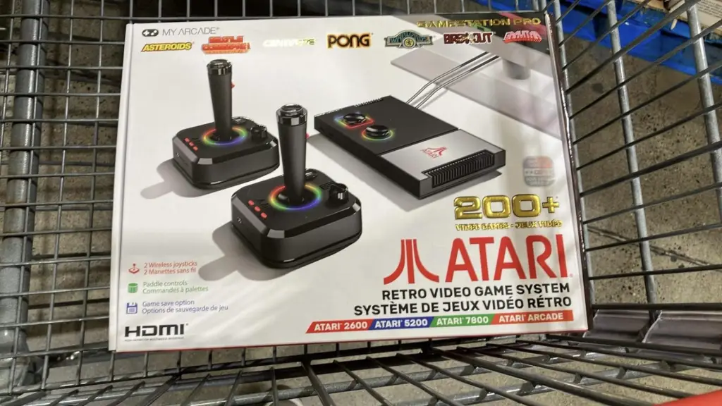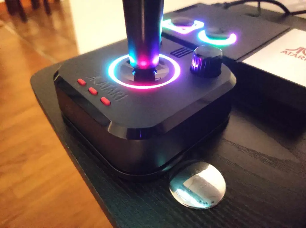 The system connects directly to a TV via HDMI and comes with two wireless joysticks modeled after classic Atari controllers. The console also includes RGB lighting effects and save-game options for some titles.