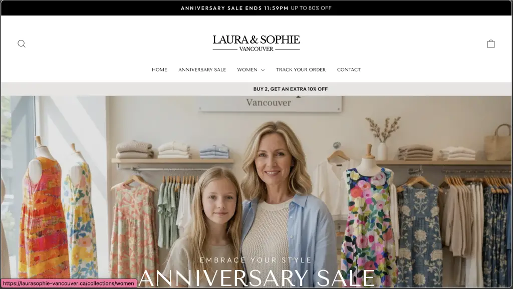Limited contact information. The website only lists an email address Info@LauraSophie-Vancouver.ca, but no mobile number, live chat, or active social media pages. This means the store isn’t actively interacting with potential customers, which can indicate poor customer service and a lack of commitment to the brand.