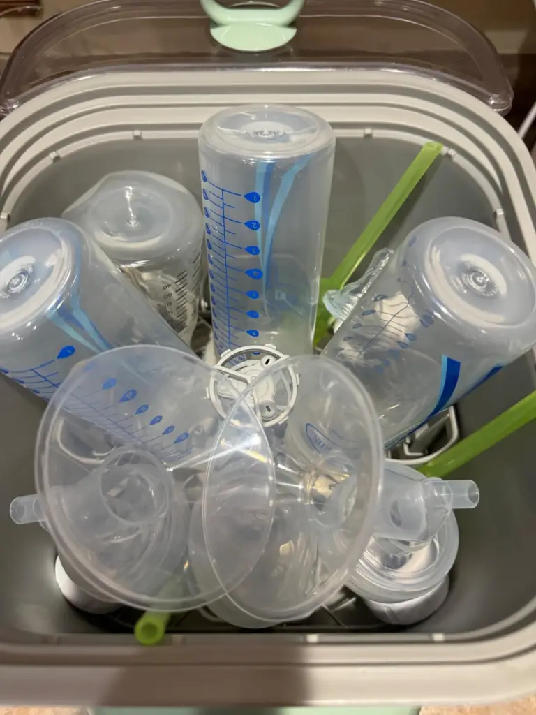On tougher spots… like stubborn dried breast milk or leftover food bits from pouches, it doesn’t always eliminate every trace. If something has sat overnight or was really crusty, you’ll still want to pre-soak or give a quick brush before running a cycle. But for regular use, it’s definitely easier and quicker than my old routine.