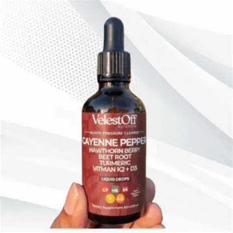 VelestOff Cayenne Pepper Drops are a liquid dietary supplement designed to support cardiovascular health using plant-based ingredients like cayenne (capsaicin), beetroot, hawthorn, turmeric, and vitamins K2 and D3.