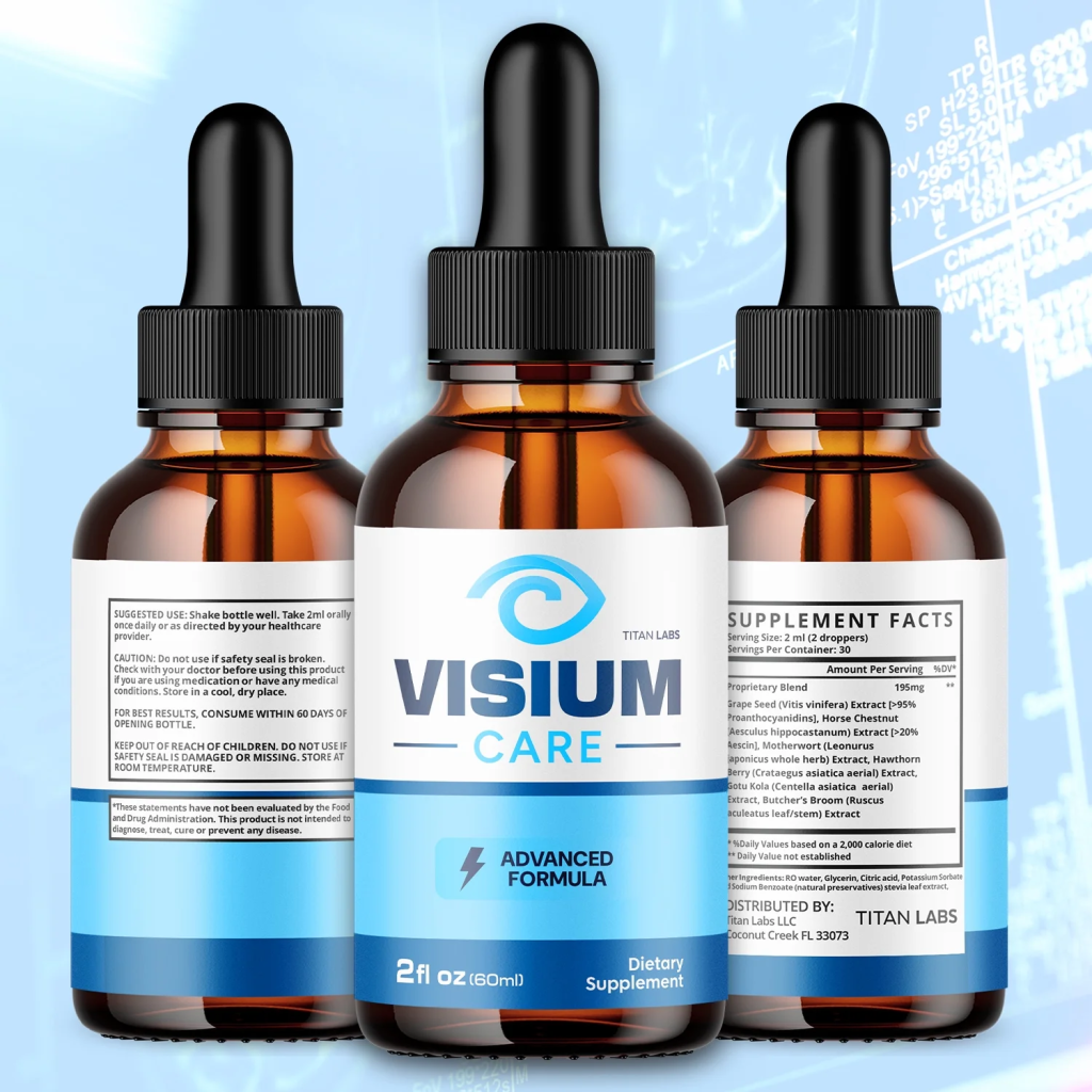 Visium Care is a liquid dietary supplement designed to support eye health using a mix of antioxidants, vitamins, and plant extracts.