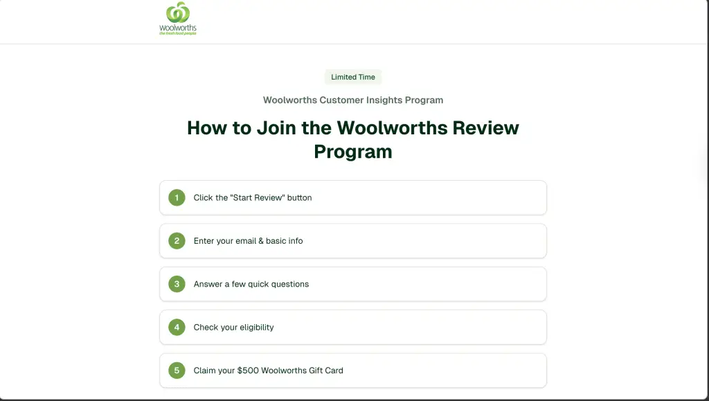The scam typically starts by luring victims with an attractive offer of a free $500 Woolworths gift card. Users are directed to the site through social media ads, emails, or pop-up notifications. The website features a professional-looking design with Woolworths branding to appear credible.